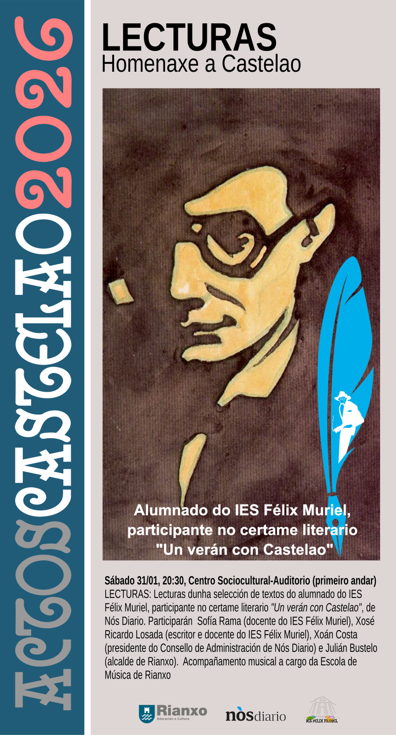 LECTURAS: Lecturas dunha selección de textos do alumnado do IES Félix Muriel, participante no certame literario "Un verán con Castelao", de Nós Diario. Participarán Sofía Rama (docente do IES Félix Muriel), Xosé Ricardo Losada (escritor e docente do IES Félix Muriel), Xoán Costa (presidente do Consello de Administración de Nós Diario) e Julián Bustelo (alcalde de Rianxo). DÍA: sábado 31 de xaneiro HORA: 20.30 h LUGAR: salón de actos do Centro...