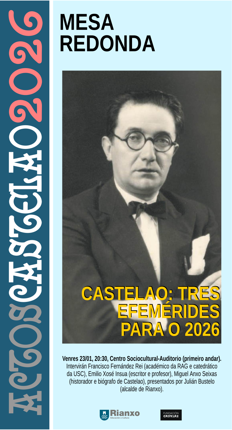 ACTOS CASTELAO 2026 MESA REDONDA: Castelao: tres efemérides para o 2026, a cargo de Francisco Fernández Rei (académico da RAG e catedrático da USC), Emilio Xosé Insua (escritor e profesor), Miguel Anxo Seixas (historiador e biógrafo de Castelao), presentados por Julián Bustelo (alcalde de Rianxo). DÍA: venres 23 de xaneiro HORA: 20.30 horas LUGAR: salón de actos do Centro Sociocultural-Auditorio