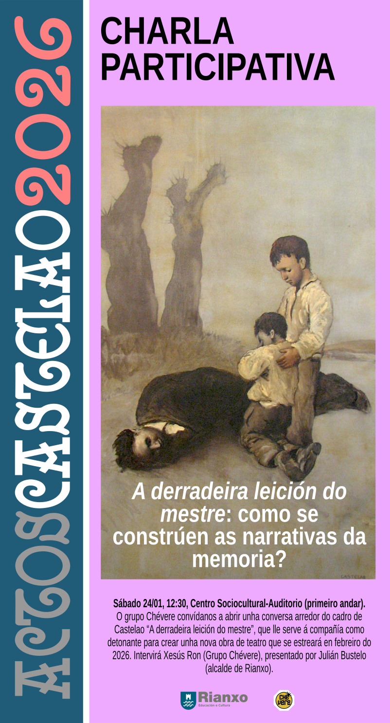 ACTOS CASTELAO 2026 CHARLA PARTICIPATIVA: A derradeira leición do mestre: como se constrúen as narrativas da memoria?. A cargo de Xesús Ron (grupo Chévere). DÍA: sábado 24 de xaneiro HORA: 12.30 horas LUGAR: salón de actos do Centro Sociocultural-Auditorio