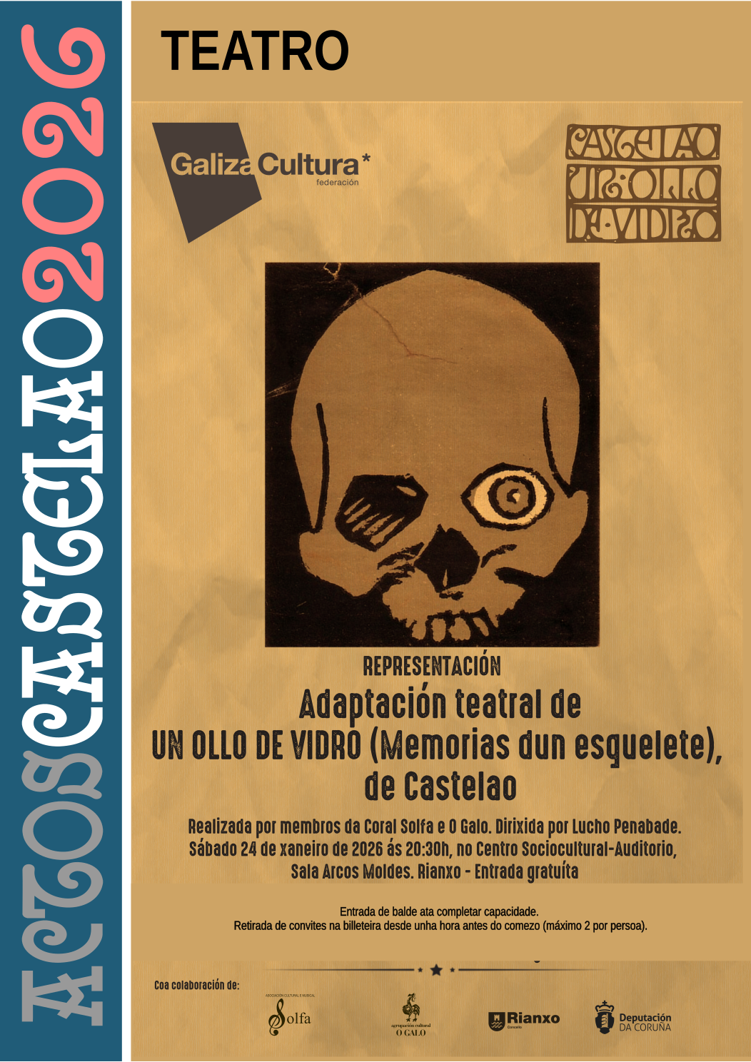 ACTOS CASTELAO 2026 TEATRO MUSICAL: Un ollo de vidro, de Castelao, adaptado pola Coral Solfa e A.C. O Galo. DÍA: sábado 24 de xaneiro HORA: 20.30 horas LUGAR: sala Arcos Moldes do Centro Sociocultural-Auditorio ENTRADA: de balde ata completar capacidade. Retirada de convites (máximo 2 por persoa) dende unha hora antes do comezo da función)