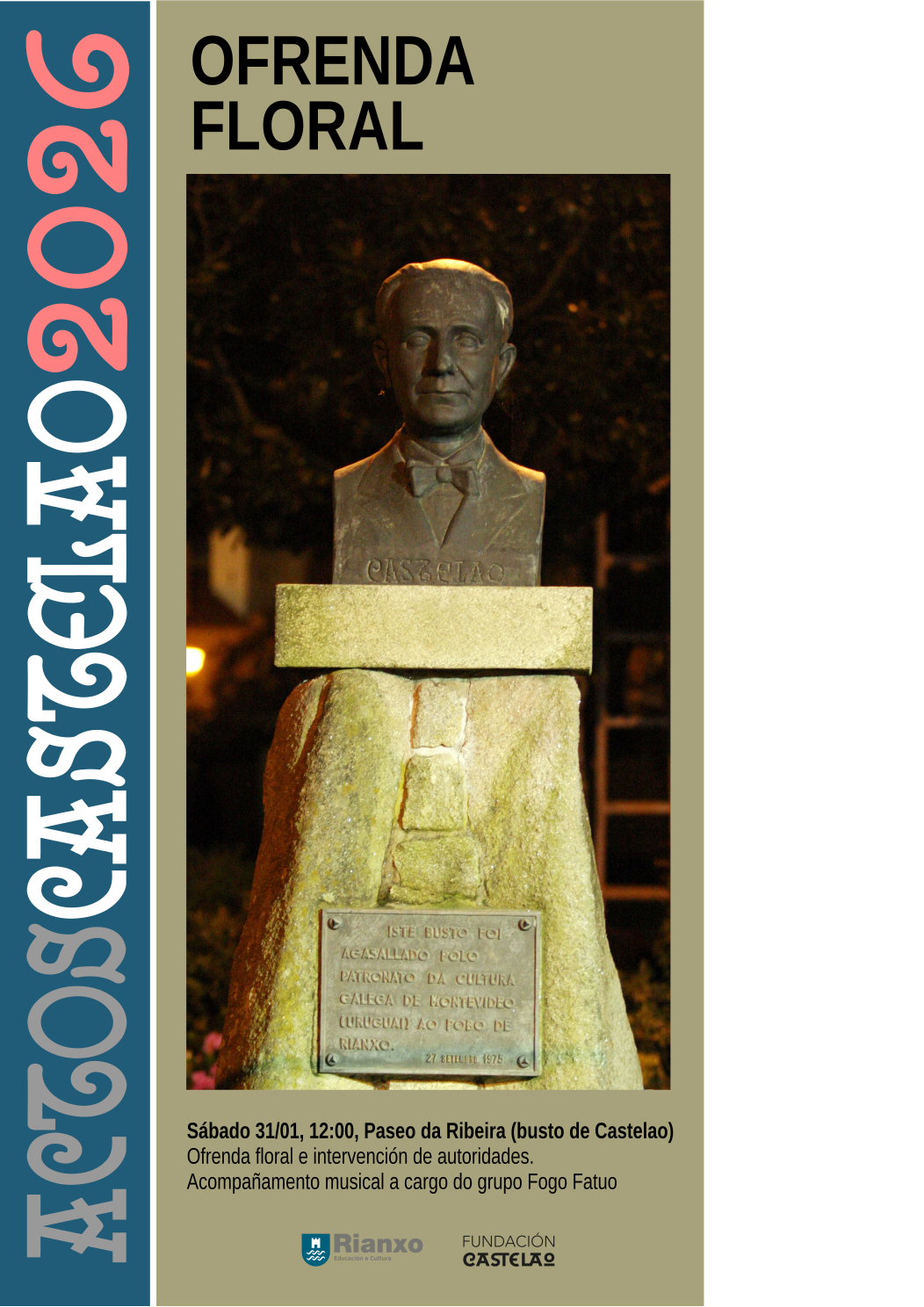 Ofrenda floral e intervención de autoridades. Acompañamento musical do grupo tradicional Fogo Fatuo DÍA: sábado 31 de xaneiro HORA: 12.00 h LUGAR: Paseo da Ribeira (busto de Castelao)