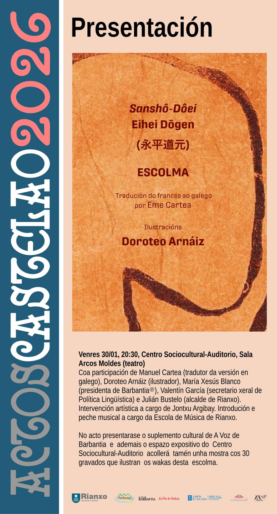 LIBROS: Presentación do libro Sanshô-Dôei, de Eihei Dôgen (永 平道元), edición xaponés-francés-galego, coa participación de Manuel Cartea (tradutor da versión en galego), Doroteo Arnáiz (ilustrador), María Xesús Blanco (presidenta de Barbantia ), Valentín García (secretario xeral de Política Lingüística) e Julián Bustelo (alcalde de Rianxo). Intervención artística a cargo de Jontxu Argibay (talla). Introdución e peche musical a cargo da Escola de Música de Rianxo. DÍA: Venres 30...