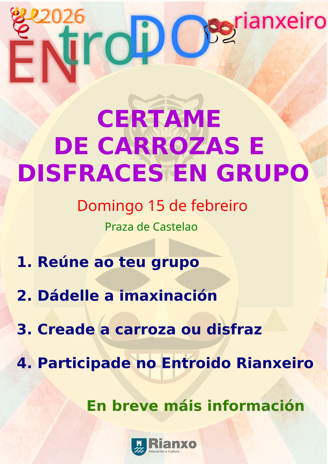 🎭🎉 RIANXO QUÉNTASE PARA O ENTROIDO! 🎉🎭 A poboación rianxeira está convidada a participar no Certame de Carrozas e Disfraces en Grupo, unha cita chea de cor, imaxinación e bo humor 🥳 👉 Reúne á familia, ás amizades, á asociación ou ao barrio 👉 Dá renda solta á creatividade 👉 Enchemos Rianxo de festa e diversión! 📅 Domingo, 15 de febreiro 📍 Rianxo Moi pronto daremos a coñecer máis información sobre inscricións, premios e horarios. Non...