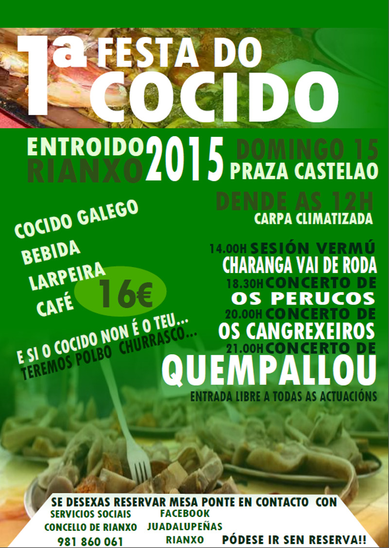O domingo de entroido, 15 de febreiro, terá lugar a Primeria Festa do Cocido en Rianxo. A sesión vermú será amenizada pola Charanga de Vai de Roda e despois pola tarde terán lugar os concertos de: