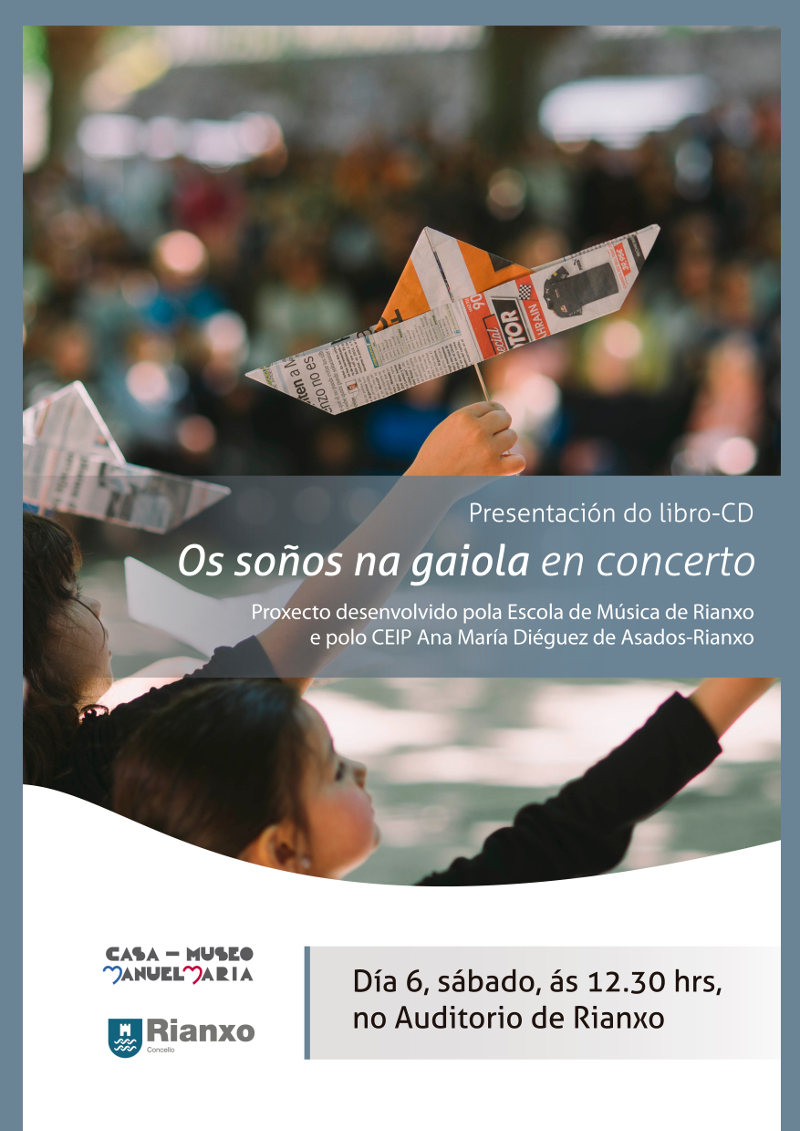 O vindeiro sábado 6 de maio, ás 12.30 horas, na Sala Arcos Moldes do Auditorio de Rianxo terá lugar a presentación do libro-CD Os soños na gaiola en concerto. Proxecto desenvolvido pola Escola de Música de Rianxo e polo CEIP Ana Mª Diéguez de Asados.