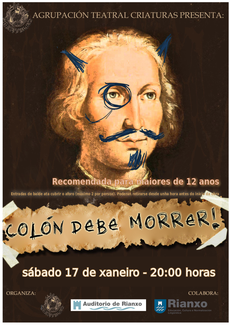 A Agrupación Teatral Criaturas volve a representar no Auditorio de Rianxo a obra Colón debe morrer, será o vindeiro sábado 17 de xaneiro ás 20.00 horas.