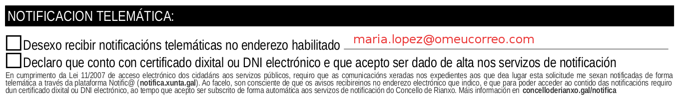 Os formularios de solicitude do Concello de Rianxo incorporan unha cela na que se pide que se indique o enderezo electrónico habilitado, que non é máis que a conta de correo electrónico na que se recibirán os avisos de que se recibiu unha notificación.