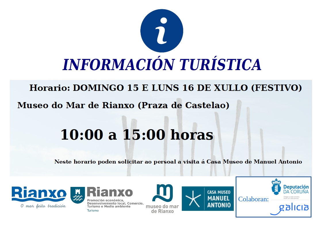 O servizo de información turística do Concello de Rianxo permanecerá aberto o domingo 15 e o luns 16, día do Carme en Rianxo e festivo local.