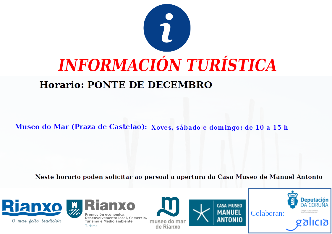 Horarios de información turística e apertura de museos do Concello de Rianxo para a ponte de decembro de 2018.
