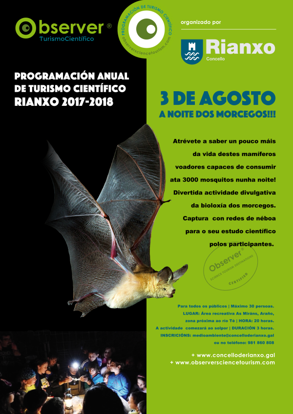 O vindeiro 3 de agosto de 2017 terá lugar a segunda actividade da programación de Turismo Científico Observer do Concello de Rianxo: A noite dos morcegos. O obxectivo principal é dar a coñecer a vida e curiosidades dos morcegos con observacións reais destes mamíferos no seu hábitat. A actividade, que comezará as 20:00 e durará unhas 3 horas, está aberta a tódolos públicos e para realizar a inscrición cómpre enviar os datos por correo-e a mediambiente@concelloderianxo.gal ou por teléfono no 981860808. Poderanse inscribir participantes ata completar as prazas e a preferencia será por orde de inscrición.